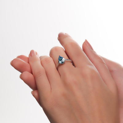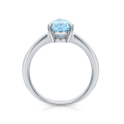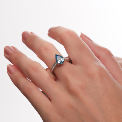 Кольцо с 1 бриллиантом выращенным, 1.88 карат, огранка груша 56 граней, цвет Голубой, чистота 5, тип огранки А; 2 бриллиантами выращенными, 0.03 карат, огранка круг 57 граней, цвет 3, чистота 5, тип огранки А; 4 бриллиантами выращенными, 0.05 карат, огранка круг 57 граней, цвет 3, чистота 5, тип огранки А; 6 бриллиантами выращенными, 0.05 карат, огранка круг 57 граней, цвет 3, чистота 5, тип огранки А; 6 бриллиантами выращенными, 0.03 карат, огранка круг 57 граней, цвет 3, чистота 5, тип огранки А; Белое золото 585 пробы.