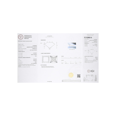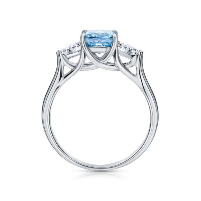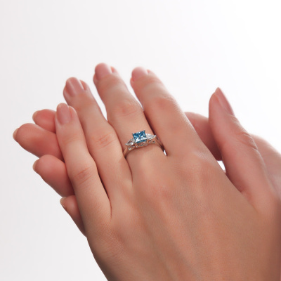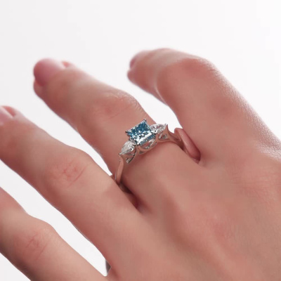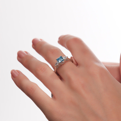 Кольцо с 1 бриллиантом выращенным, 1.01 карат, огранка принцесса 65 граней, цвет Голубой, чистота 5, тип огранки А; 2 бриллиантами выращенными, 0.33 карат, огранка груша 56 граней, цвет 3, чистота 5, тип огранки А; Белое золото 585 пробы.