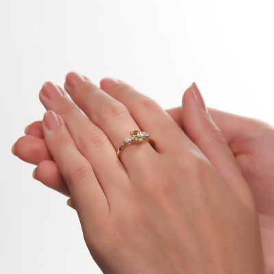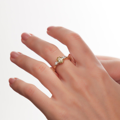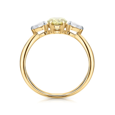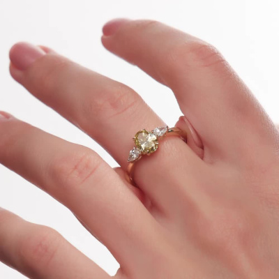 Кольцо с 1 бриллиантом выращенным, 0.84 карат, огранка овал 57 граней, цвет Желтый, чистота 5, тип огранки А; 2 бриллиантами выращенными, 0.21 карат, огранка груша 56 граней, цвет 3, чистота 5, тип огранки А; Желтое золото 585 пробы.