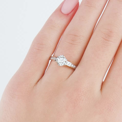 Кольцо с 1 бриллиантом природным, 0.9 карат, огранка круг 57 граней, цвет 5, чистота 5, тип огранки А; 12 бриллиантами природными, 0.25 карат, огранка круг 57 граней, цвет 3, чистота 6, тип огранки А; Желтое золото 585 пробы.