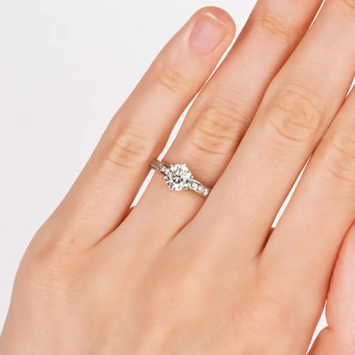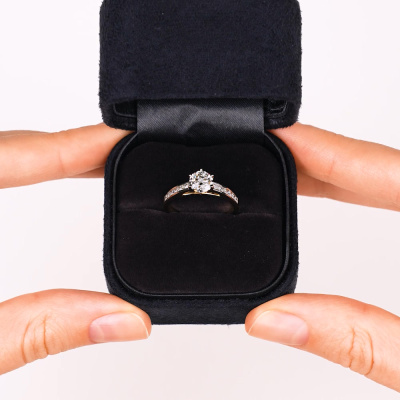 Кольцо с 1 бриллиантом природным, 0.9 карат, огранка круг 57 граней, цвет 5, чистота 5, тип огранки А; 12 бриллиантами природными, 0.255 карат, огранка круг 57 граней, цвет 3, чистота 6, тип огранки А; Желтое золото 585 пробы.