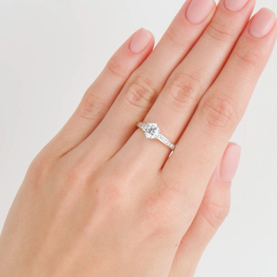 Кольцо с 1 бриллиантом природным, 0.85 карат, огранка круг 57 граней, цвет 3, чистота 7, тип огранки А; 12 бриллиантами природными, 0.25 карат, огранка круг 57 граней, цвет 3, чистота 6, тип огранки А; Желтое золото 585 пробы.
