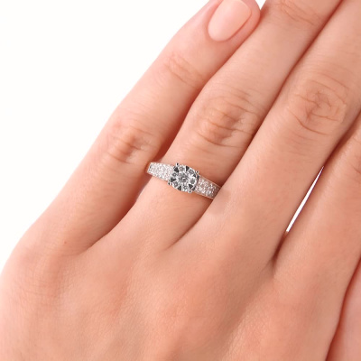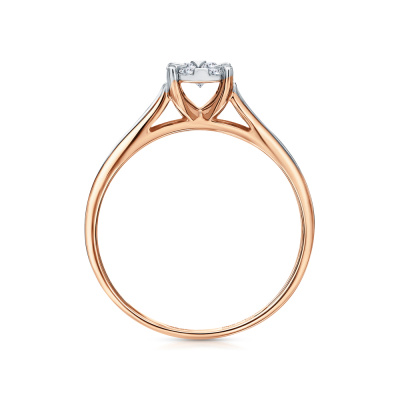 Кольцо с 1 бриллиантом природным, 0.05 карат, огранка круг 57 граней, цвет 3, чистота 6, тип огранки А; 6 бриллиантами природными, 0.11 карат, огранка круг 57 граней, цвет 3, чистота 6, тип огранки А; 8 бриллиантами природными, 0.05 карат, огранка круг 57 граней, цвет 3, чистота 6, тип огранки А; 8 бриллиантами природными, 0.03 карат, огранка круг 17 граней, цвет 2, чистота 2, тип огранки А; 12 бриллиантами природными, 0.02 карат, огранка круг 17 граней, цвет 2, чистота 2, тип огранки А; Розовое и белое золото 585 пробы.