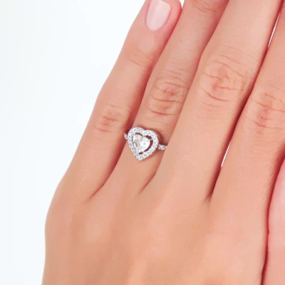 Кольцо с 1 бриллиантом природным, 0.5 карат, огранка сердце 57 граней, цвет 3, чистота 5, тип огранки А; 36 бриллиантами природными, 0.19 карат, огранка круг 57 граней, цвет 3, чистота 6, тип огранки А; Белое золото 585 пробы.