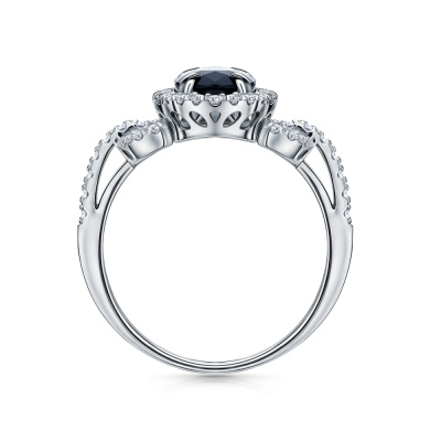 Кольцо с 50 бриллиантами природными, 0.2 карат, огранка круг 17 граней, цвет 2, чистота 2, тип огранки А; 1 сапфиром природным, 1.37 карат, цвет 2, чистота 2, тип огранки Б; Белое золото 585 пробы.
