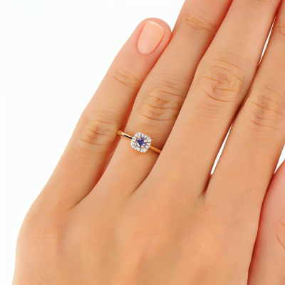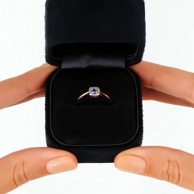 Кольцо с 8 бриллиантами природными, 0.02 карат, огранка круг 17 граней, цвет 2, чистота 2, тип огранки А; 1 танзанитом природным, 0.13 карат; Розовое золото 585 пробы.