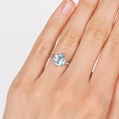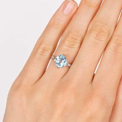 Кольцо с 10 бриллиантами природными, 0.03 карат, огранка круг 17 граней, цвет 2, чистота 2, тип огранки А; 1 топазом скай природным, 2.66 карат; Белое золото 585 пробы.
