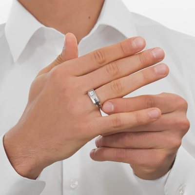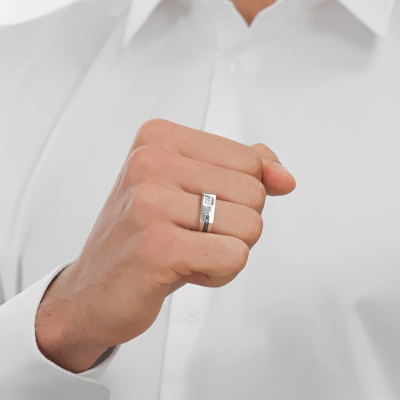 Кольцо с 1 бриллиантом природным, 0.054 карат, огранка круг 57 граней, цвет 3, чистота 6, тип огранки А; 7 бриллиантами черными природными облагороженными, 0.06 карат, огранка круг 57 граней, цвет 7, чистота 6, тип огранки А; Белое золото 585 пробы.