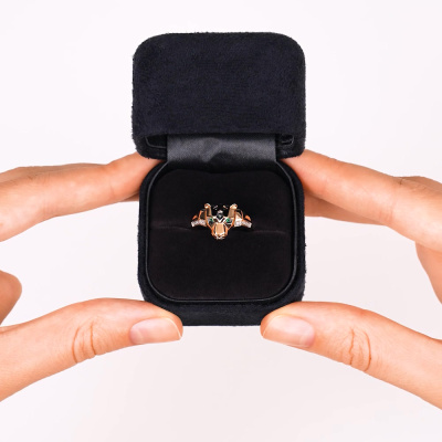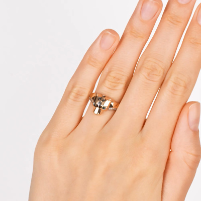 Кольцо с 10 бриллиантами природными, 0.03 карат, огранка круг 17 граней, цвет 2, чистота 2, тип огранки А; 2 изумрудами природными, 0.01 карат, цвет 3, чистота 3; 4 бриллиантами черными природными облагороженными, 0.01 карат, огранка круг 57 граней, цвет 7, чистота 6, тип огранки А; Розовое золото 585 пробы.