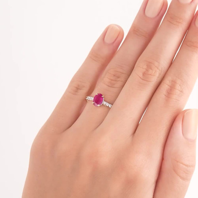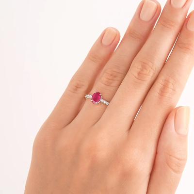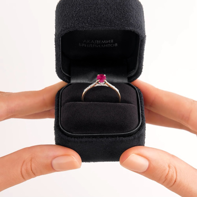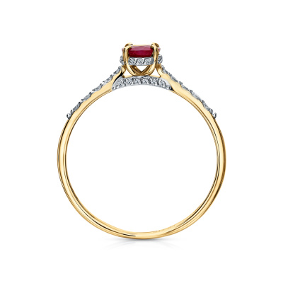 Кольцо с 4 бриллиантами природными, 0.08 карат, огранка круг 57 граней, цвет 3, чистота 6, тип огранки А; 4 бриллиантами природными, 0.06 карат, огранка круг 57 граней, цвет 3, чистота 6, тип огранки А; 2 бриллиантами природными, 0.01 карат, огранка круг 57 граней, цвет 3, чистота 6, тип огранки А; 26 бриллиантами природными, 0.05 карат, огранка круг 17 граней, цвет 2, чистота 2, тип огранки А; 1 рубином природным, 0.94 карат, цвет 2, чистота 2, тип огранки Б; Желтое золото 585 пробы.