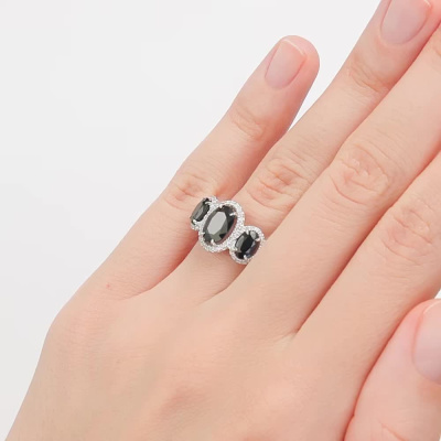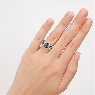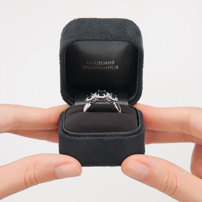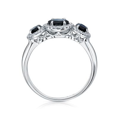 Кольцо с 53 бриллиантами природными, 0.15 карат, огранка круг 17 граней, цвет 2, чистота 2, тип огранки А; 1 сапфиром природным, 1.63 карат, цвет 2, чистота 2, тип огранки Б; 2 сапфирами природными, 1.05 карат, цвет 2, чистота 2, тип огранки Б; Белое золото 585 пробы.