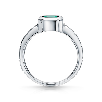 Кольцо с 8 бриллиантами природными, 0.89 карат, огранка багет 25 граней, цвет 3, чистота 5, тип огранки А; 1 изумрудом природным, 1.28 карат, цвет 4, чистота 3, тип огранки Б; Белое золото 585 пробы.