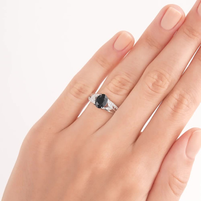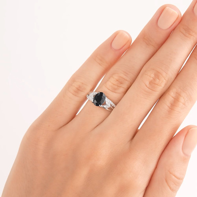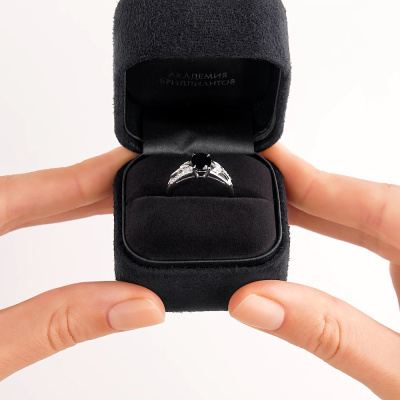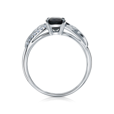 Кольцо с 14 бриллиантами природными, 0.05 карат, огранка круг 17 граней, цвет 2, чистота 2, тип огранки А; 4 бриллиантами природными, 0.007 карат, огранка круг 17 граней, цвет 2, чистота 2, тип огранки А; 1 сапфиром природным, 1.53 карат, цвет 2, чистота 2, тип огранки Б; Белое золото 585 пробы.
