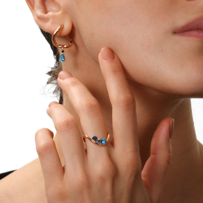 Кольцо с 1 бриллиантом природным, 0.008 карат, огранка круг 17 граней, цвет 2, чистота 2, тип огранки А; 1 топазом свисс природным, 0.45 карат; 1 топазом лондон природным, 0.17 карат; 1 сапфиром природным, 0.04 карат, цвет 2, чистота 2, тип огранки В; Розовое золото 585 пробы.
