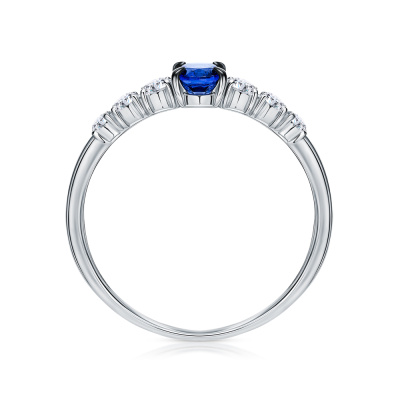 Кольцо с 1 сапфиром выращенным, 0.42 карат; 2 бриллиантами выращенными, 0.11 карат, огранка круг 57 граней, цвет 3, чистота 5, тип огранки А; 2 бриллиантами выращенными, 0.08 карат, огранка круг 57 граней, цвет 3, чистота 5, тип огранки А; 2 бриллиантами выращенными, 0.04 карат, огранка круг 57 граней, цвет 3, чистота 5, тип огранки А; Белое золото 585 пробы.
