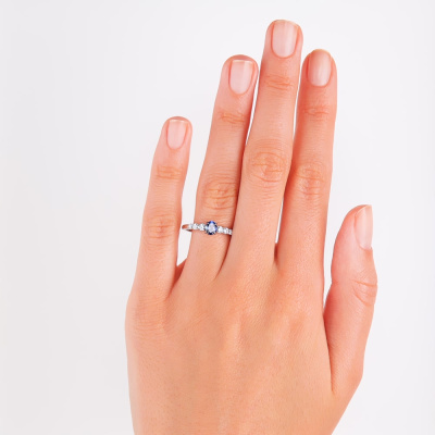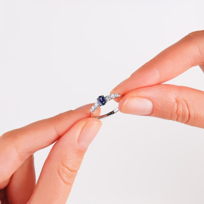 Кольцо с 1 сапфиром выращенным, 0.43 карат; 2 бриллиантами выращенными, 0.11 карат, огранка круг 57 граней, цвет 3, чистота 5, тип огранки А; 2 бриллиантами выращенными, 0.08 карат, огранка круг 57 граней, цвет 3, чистота 5, тип огранки А; 2 бриллиантами выращенными, 0.05 карат, огранка круг 57 граней, цвет 3, чистота 5, тип огранки А; Белое золото 585 пробы.