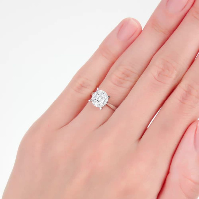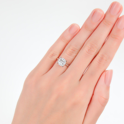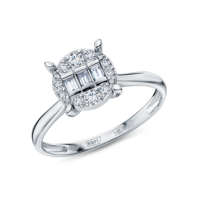 Кольцо с 3 бриллиантами природными, 0.12 карат, огранка багет 25 граней, цвет 3, чистота 5, тип огранки А; 2 бриллиантами природными, 0.06 карат, огранка круг 57 граней, цвет 4, чистота 6, тип огранки А; 4 бриллиантами природными, 0.03 карат, огранка круг 57 граней, цвет 4, чистота 6, тип огранки А; 4 бриллиантами природными, 0.01 карат, огранка круг 17 граней, цвет 2, чистота 3, тип огранки А; 4 бриллиантами природными, 0.008 карат, огранка круг 17 граней, цвет 2, чистота 3, тип огранки А; Белое золото 585 пробы.