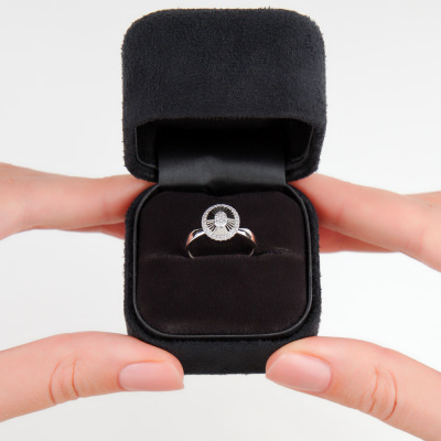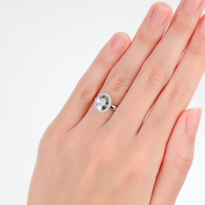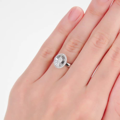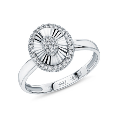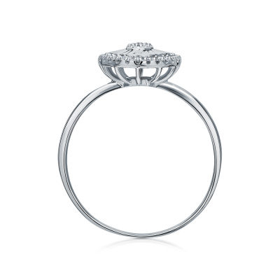 Кольцо с 28 бриллиантами природными, 0.08 карат, огранка круг 17 граней, цвет 2, чистота 3, тип огранки А; 10 бриллиантами природными, 0.02 карат, огранка круг 17 граней, цвет 2, чистота 3, тип огранки А; Белое золото 585 пробы.