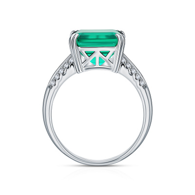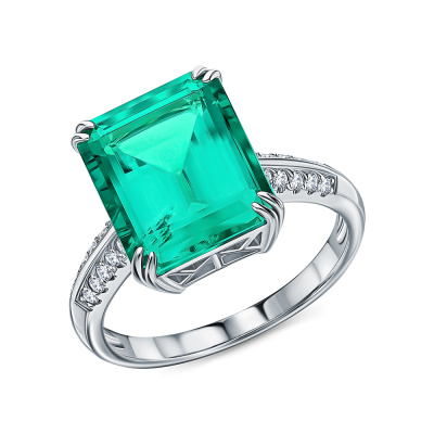 Кольцо с 1 изумрудом выращенным Колумбия, 5.43 карат; 20 бриллиантами выращенными, 0.17 карат, огранка круг 57 граней, цвет 3, чистота 5, тип огранки А; Белое золото 585 пробы.