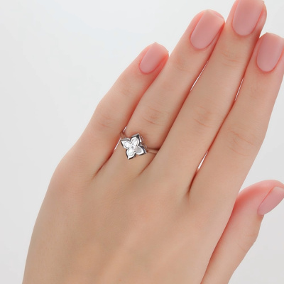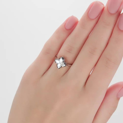 Кольцо с 1 бриллиантом природным, 0.005 карат, огранка круг 17 граней, цвет 2, чистота 2, тип огранки А; 1 перламутром белым природным, 0.48 карат; Белое золото 585 пробы.