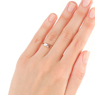 Кольцо с 1 бриллиантом природным, 0.007 карат, огранка круг 57 граней, цвет 3, чистота 6, тип огранки А; 1 бриллиантом природным, 0.003 карат, огранка круг 17 граней, цвет 2, чистота 2, тип огранки А; 1 бриллиантом природным, 0.002 карат, огранка круг 17 граней, цвет 2, чистота 2, тип огранки А; Розовое золото 585 пробы.