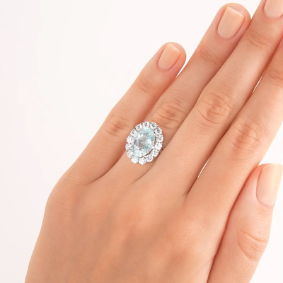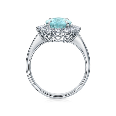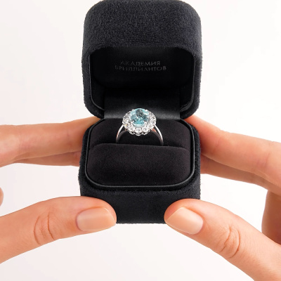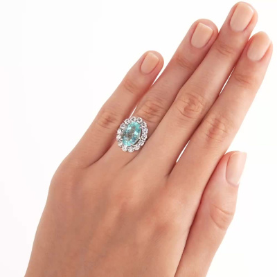 Кольцо с 14 бриллиантами природными, 1.06 карат, огранка круг 57 граней, цвет 3, чистота 6, тип огранки А; 1 турмалином параиба природным, 3.44 карат; Белое золото 585 пробы.