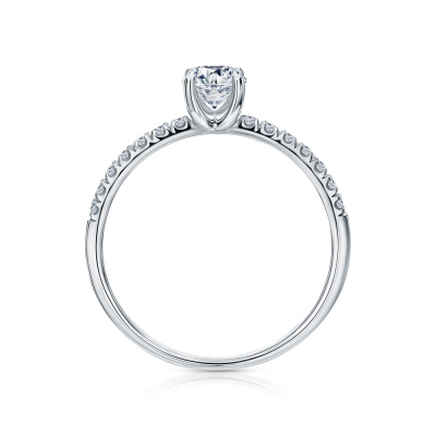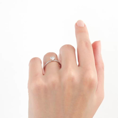 Кольцо с 1 бриллиантом выращенным, 0.43 карат, огранка круг 57 граней, цвет 3, чистота 5, тип огранки А; 14 бриллиантами выращенными, 0.11 карат, огранка круг 57 граней, цвет 3, чистота 5, тип огранки А; Белое золото 585 пробы.