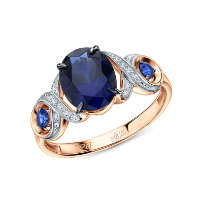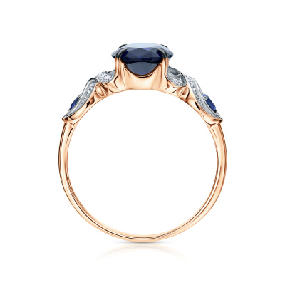 Кольцо с 16 бриллиантами природными, 0.06 карат, огранка круг 17 граней, цвет 2, чистота 2, тип огранки А; 1 сапфиром синтетическим, 2.14 карат; 2 сапфирами синтетическими, 0.15 карат; Розовое золото 585 пробы.