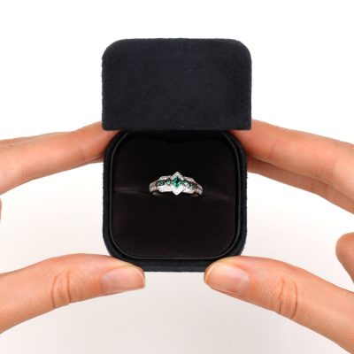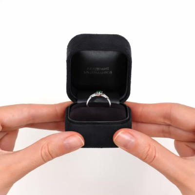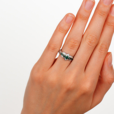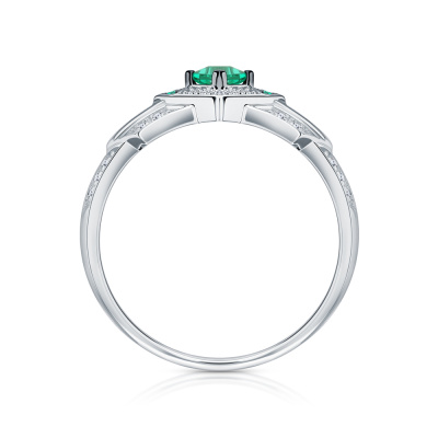 Кольцо с 30 бриллиантами природными, 0.06 карат, огранка круг 17 граней, цвет 2, чистота 2, тип огранки А; 1 гидротермальным изумрудом, 0.1 карат, тип огранки В; 6 гидротермальными изумрудами, 0.02 карат, тип огранки В; Белое золото 585 пробы.