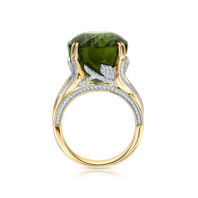 Кольцо с 242 бриллиантами природными, 0.43 карат, огранка круг 17 граней, цвет 2, чистота 2, тип огранки А; 1 турмалином зеленым природным, 18.83 карат; Желтое золото 585 пробы.