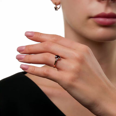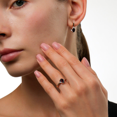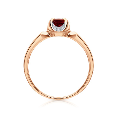 Кольцо с 4 бриллиантами природными, 0.01 карат, огранка круг 17 граней, цвет 2, чистота 2, тип огранки А; 8 бриллиантами природными, 0.01 карат, огранка круг 17 граней, цвет 2, чистота 2, тип огранки А; 1 гранатом природным, 0.91 карат; Розовое золото 585 пробы.