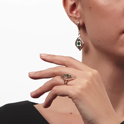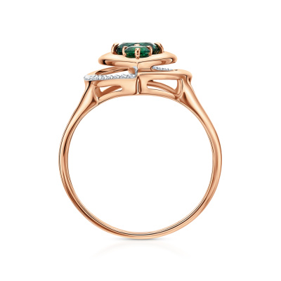 Кольцо с 18 бриллиантами природными, 0.08 карат, огранка круг 17 граней, цвет 2, чистота 2; 1 гидротермальным изумрудом, 0.45 карат; 2 гидротермальными изумрудами, 0.2 карат; Розовое золото 585 пробы.