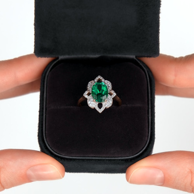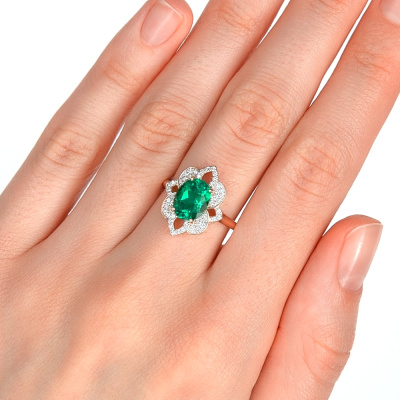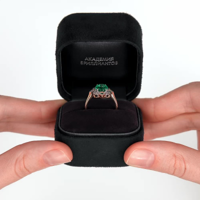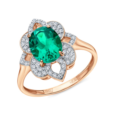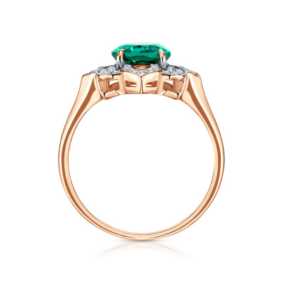 Кольцо с 48 бриллиантами природными, 0.19 карат, огранка круг 17 граней, цвет 2, чистота 2, тип огранки А; 1 изумрудом выращенным Колумбия, 1.62 карат; Розовое золото 585 пробы.