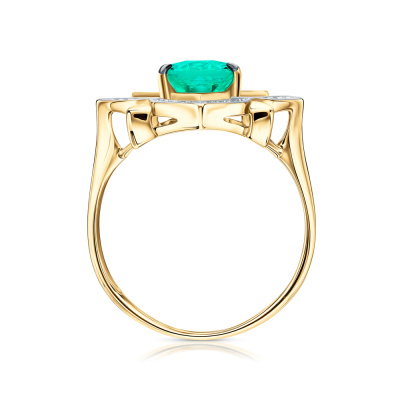 Кольцо с 40 бриллиантами природными, 0.12 карат, огранка круг 17 граней, цвет 2, чистота 2, тип огранки А; 1 изумрудом выращенным Колумбия, 1.65 карат; Желтое золото 585 пробы.