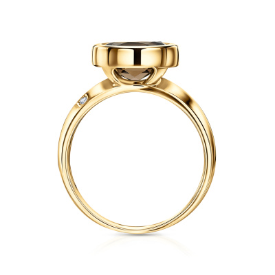 Кольцо с 1 бриллиантом природным, 0.008 карат, огранка круг 57 граней, цвет 3, чистота 6, тип огранки А; 1 кварцем дымчатым природным, 1.69 карат; Желтое золото 585 пробы.