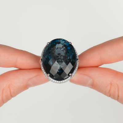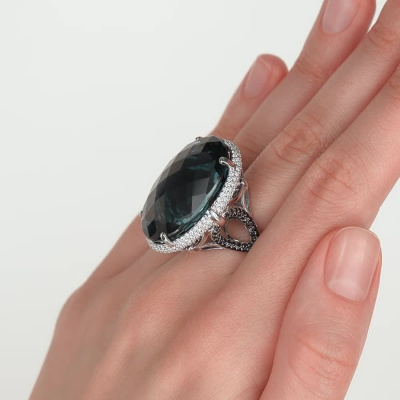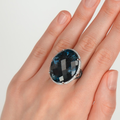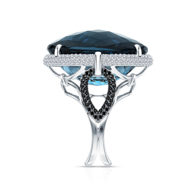 Кольцо с 168 бриллиантами природными, 0.87 карат, огранка круг 57 граней, цвет 3, чистота 6, тип огранки А; 1 топазом лондон природным, 62.63 карат, тип огранки А; 84 бриллиантами черными природными облагороженными, 0.52 карат, огранка круг 57 граней, цвет 7, чистота 6, тип огранки А; Белое золото 585 пробы.