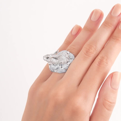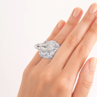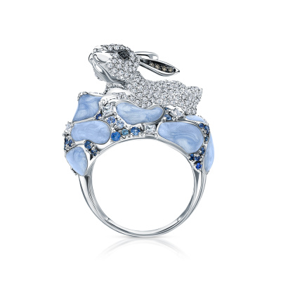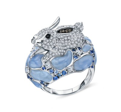 Кольцо с 7 бриллиантами природными, 0.33 карат, огранка принцесса 65 граней, цвет 3, чистота 4, тип огранки А; 264 бриллиантами природными, 1.22 карат, огранка круг 57 граней, цвет 3, чистота 5, тип огранки А; 4 сапфирами голубыми природными, 0.1 карат, цвет 2, чистота 2, тип огранки А; 7 сапфирами голубыми природными, 0.11 карат, цвет 2, чистота 2, тип огранки А; 30 сапфирами голубыми природными, 0.3 карат, цвет 2, чистота 2, тип огранки А; 8 бриллиантами коричневыми природными, 0.04 карат, огранка круг 57 граней, цвет 7, чистота 5, тип огранки А; эмаль витражная; Белое золото 585 пробы.
