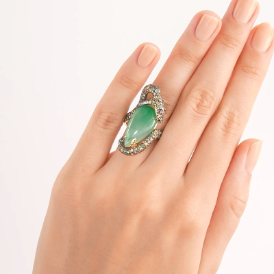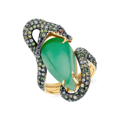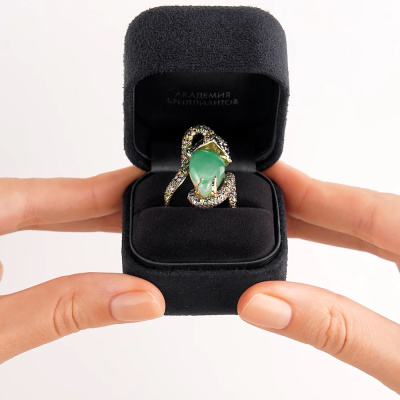 Золотое кольцо с бриллиантами природными, жадеитом и сапфирами природными