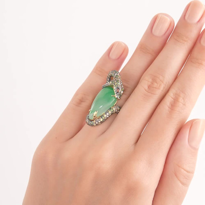 Кольцо с 1 жадеитом зеленым, 10.72 карат, тип огранки А; 1 бриллиантом коричневым природным, 0.02 карат, огранка круг 57 граней, цвет 7, чистота 5, тип огранки А; 40 сапфирами желтыми природными, 0.46 карат, тип огранки А; 25 бриллиантами коричневыми природными, 0.2 карат, огранка круг 57 граней, цвет 7, чистота 6, тип огранки А; 44 бриллиантами зелеными природными облагороженными, 0.34 карат, огранка круг 57 граней, цвет 5, чистота 5, тип огранки А; 20 сапфирами желтыми природными, 0.13 карат, тип огранки А; 22 бриллиантами зелеными природными облагороженными, 0.12 карат, огранка круг 57 граней, цвет 5, чистота 5, тип огранки А; 28 бриллиантами коричневыми природными, 0.14 карат, огранка круг 57 граней, цвет 7, чистота 5, тип огранки А; Желтое золото 585 пробы.
