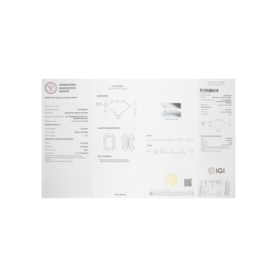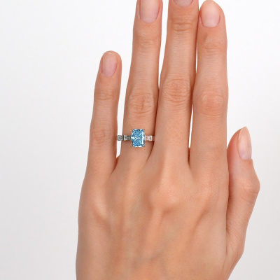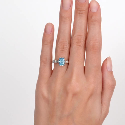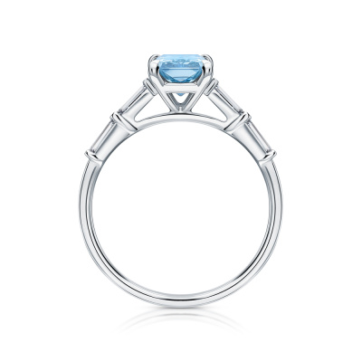 Кольцо с 1 бриллиантом выращенным, 1.55 карат, цвет Голубой, чистота 5, тип огранки А; 4 бриллиантами выращенными, 0.45 карат, огранка багет 25 граней, цвет 3, чистота 5, тип огранки А; Белое золото 585 пробы.