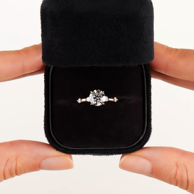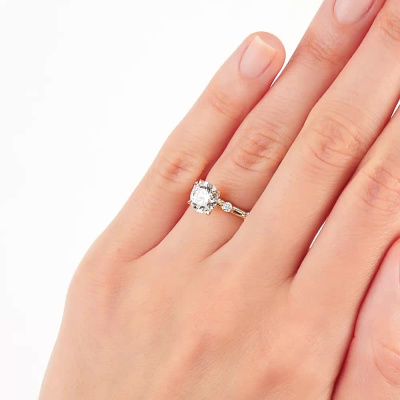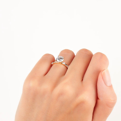 Кольцо с 1 бриллиантом выращенным, 1.55 карат, огранка круг 57 граней, цвет 4, чистота 5, тип огранки А; 4 бриллиантами выращенными, 0.18 карат, огранка круг 57 граней, цвет 3, чистота 5, тип огранки А; Желтое золото 585 пробы.