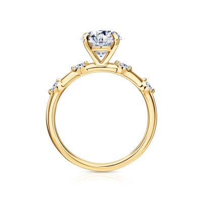 Кольцо с 1 бриллиантом выращенным, 1.55 карат, огранка круг 57 граней, цвет 4, чистота 5, тип огранки В; 4 бриллиантами выращенными, 0.19 карат, огранка круг 57 граней, цвет 3, чистота 5, тип огранки В; Желтое золото 585 пробы.
