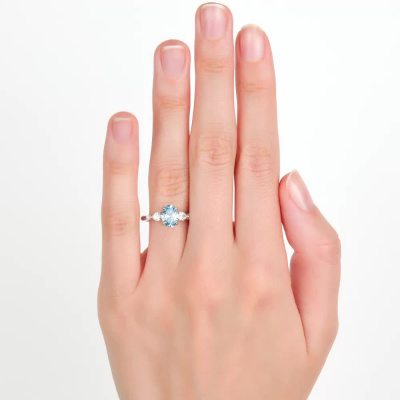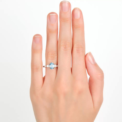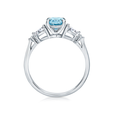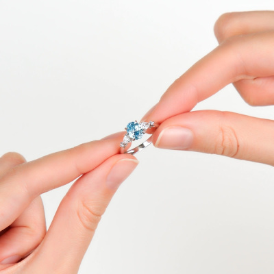 Кольцо с 1 бриллиантом выращенным, 1.07 карат, огранка овал 57 граней, цвет Голубой, чистота 5, тип огранки А; 2 бриллиантами выращенными, 0.28 карат, огранка груша 56 граней, цвет 3, чистота 5, тип огранки А; 2 бриллиантами выращенными, 0.02 карат, огранка круг 57 граней, цвет 3, чистота 5, тип огранки А; Белое золото 585 пробы.
