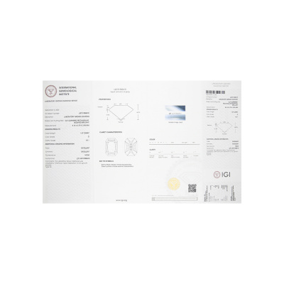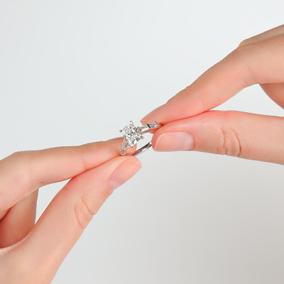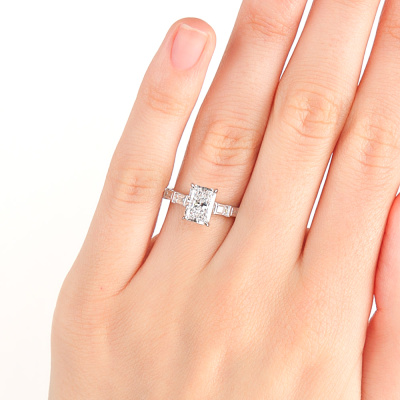 Кольцо с 1 бриллиантом выращенным, 1.53 карат, цвет 4, чистота 5, тип огранки А; 4 бриллиантами выращенными, 0.45 карат, огранка багет 25 граней, цвет 3, чистота 5, тип огранки А; Белое золото 585 пробы.