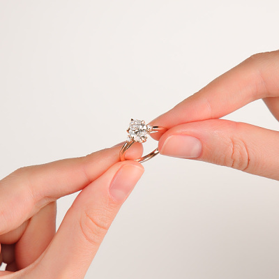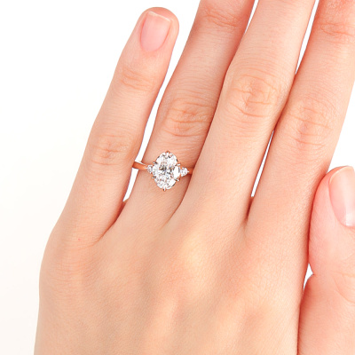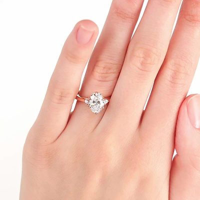 Кольцо с 1 бриллиантом выращенным, 1.53 карат, огранка овал 57 граней, цвет 4, чистота 5, тип огранки А; 2 бриллиантами выращенными, 0.06 карат, огранка круг 57 граней, цвет 3, чистота 5, тип огранки А; Розовое золото 585 пробы.