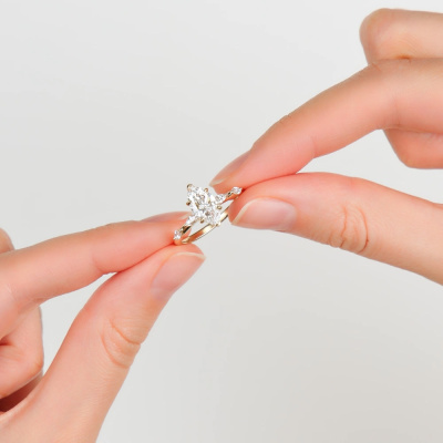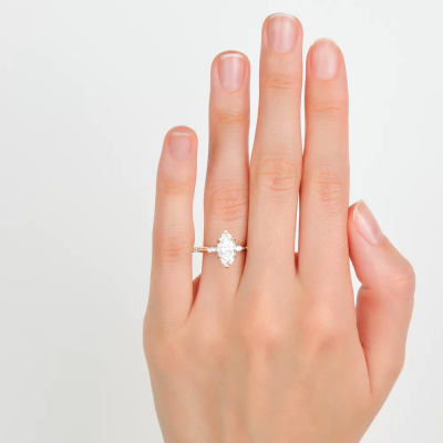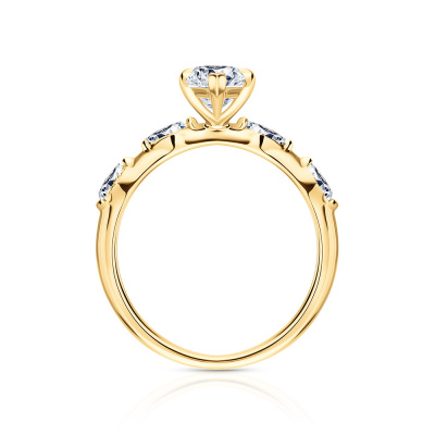 Кольцо с 1 бриллиантом выращенным, 1.52 карат, огранка маркиз 55 граней, цвет 4, чистота 5, тип огранки А; 4 бриллиантами выращенными, 0.25 карат, огранка маркиз 55 граней, цвет 3, чистота 5, тип огранки А; Желтое золото 585 пробы.