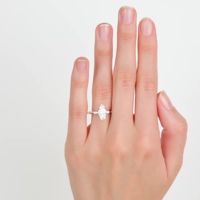 Кольцо с 1 бриллиантом выращенным, 1.55 карат, огранка маркиз 55 граней, цвет 4, чистота 5, тип огранки А; 4 бриллиантами выращенными, 0.25 карат, огранка маркиз 55 граней, цвет 3, чистота 5, тип огранки А; Желтое золото 585 пробы.