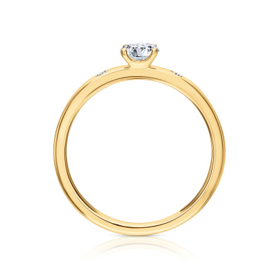 Кольцо с 1 бриллиантом выращенным, 0.42 карат, огранка круг 57 граней, цвет 4, чистота 5, тип огранки А; 2 бриллиантами выращенными, 0.04 карат, огранка круг 57 граней, цвет 3, чистота 5, тип огранки А; Желтое золото 585 пробы.