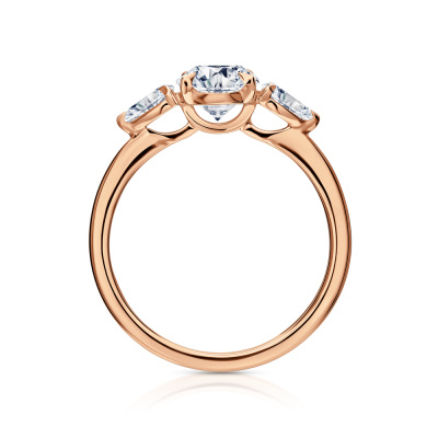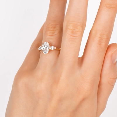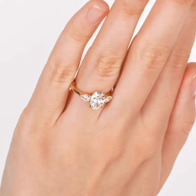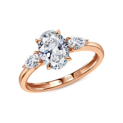 Кольцо с 1 бриллиантом выращенным, 1.51 карат, огранка овал 57 граней, цвет 4, чистота 5, тип огранки А; 2 бриллиантами выращенными, 0.34 карат, огранка груша 56 граней, цвет 3, чистота 5, тип огранки А; Розовое золото 585 пробы.