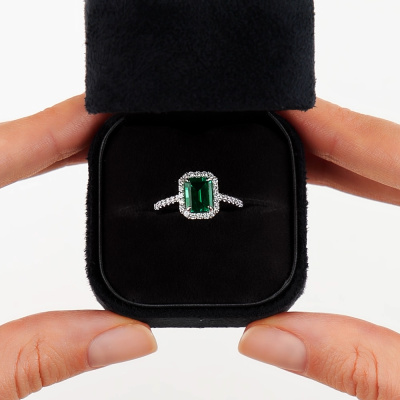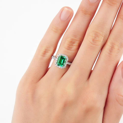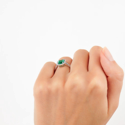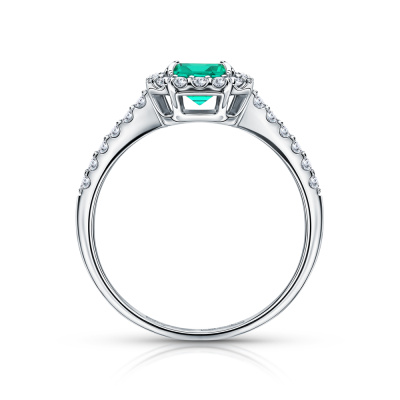 Кольцо с 1 изумрудом выращенным Колумбия, 1.32 карат; 12 бриллиантами выращенными, 0.14 карат, огранка круг 57 граней, цвет 3, чистота 5, тип огранки А; 20 бриллиантами выращенными, 0.17 карат, огранка круг 57 граней, цвет 3, чистота 5, тип огранки А; Белое золото 585 пробы.